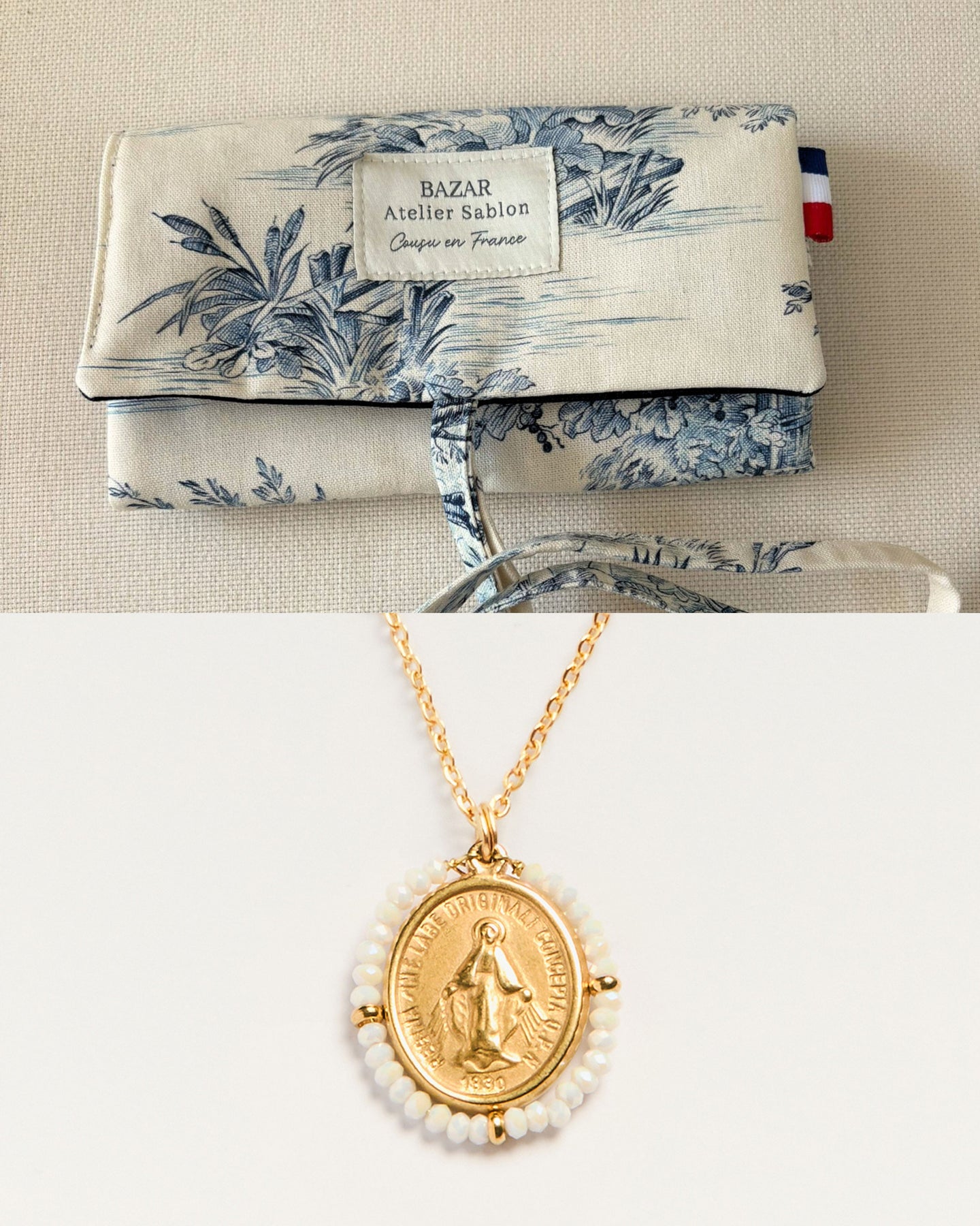 Ce coffret comprend : une médaille Santa Maria Shiny Cream et une pochette à bijoux cousue main de chez Bazar Atelier Sablon.